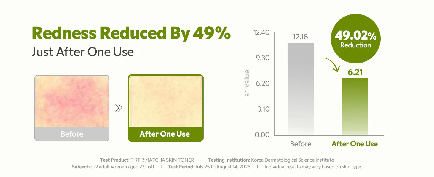 - Redness Relief – Matcha-PDRN and patented Green Herb Protector calm irritation and replenish moisture, helping sensitive skin recover.
